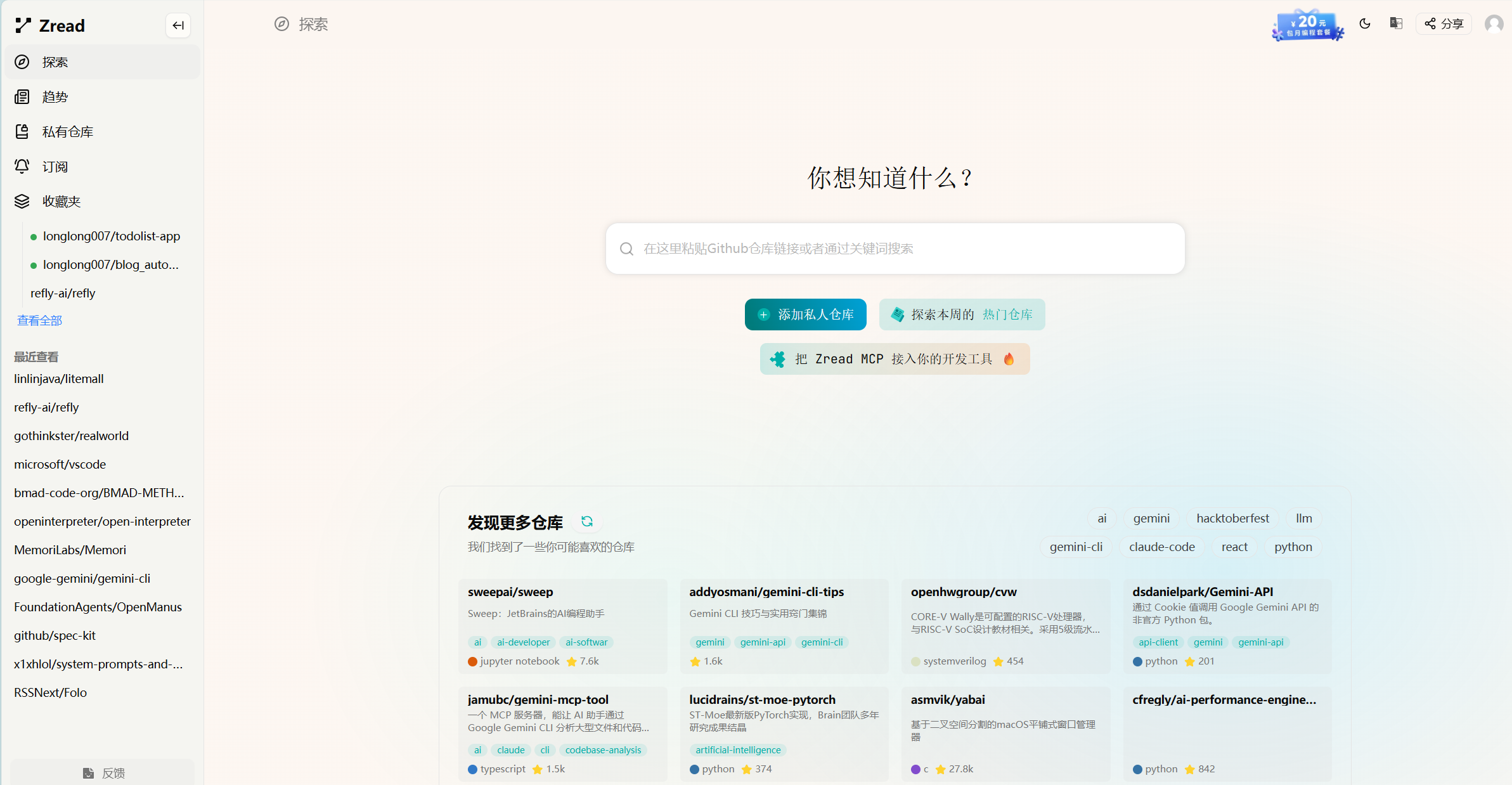 一键解析代码阅读神器 2026-01-13 AIcoding>AI每日分享 204 words aicodinggit 学习编程,输入是关键,百练读为先~推荐两款强大的代码阅读神器。 一个是Zread,地址:Zread 另一个是CodeWiki,地址:Code Wiki 可以将github代码地址,甚至是你的个人知识库上传到github上,然后网站会自动分析。 会画出很多架构图、流程图,Zread有中英文切换,两者都可以免费使用AI聊天挖掘更多信息内容。是学习代码的神器。 个人初体验还是Zread体验更好,但见仁见智,大家快去试试吧。 todolist网站学习开发记录 1. 构建个人博客方式(任选一种)